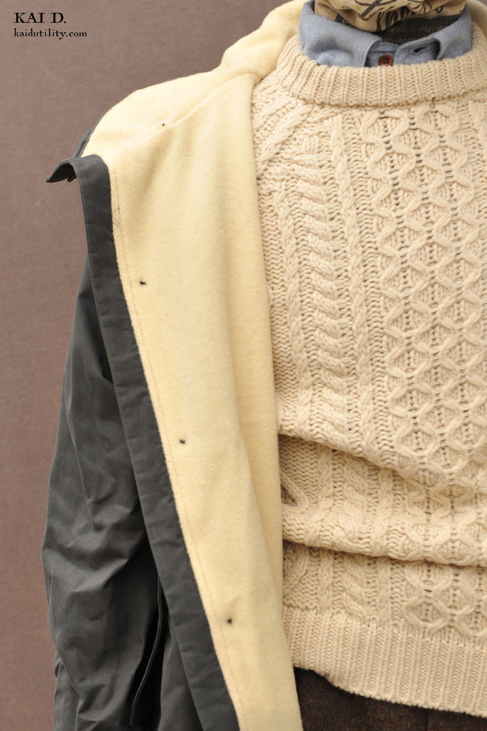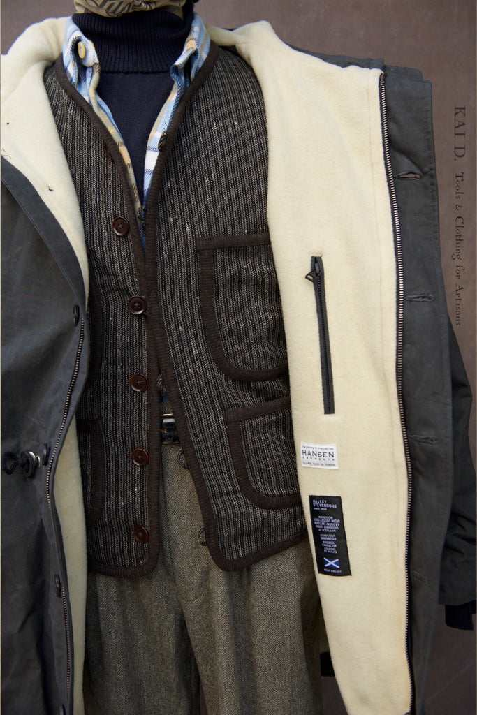 STORM is an oversized coat. Made in 100% waxed cotton. It comes with a full 100% wool lining, a large hood, large secure pockets, drawstrings and a big overlap at the front.