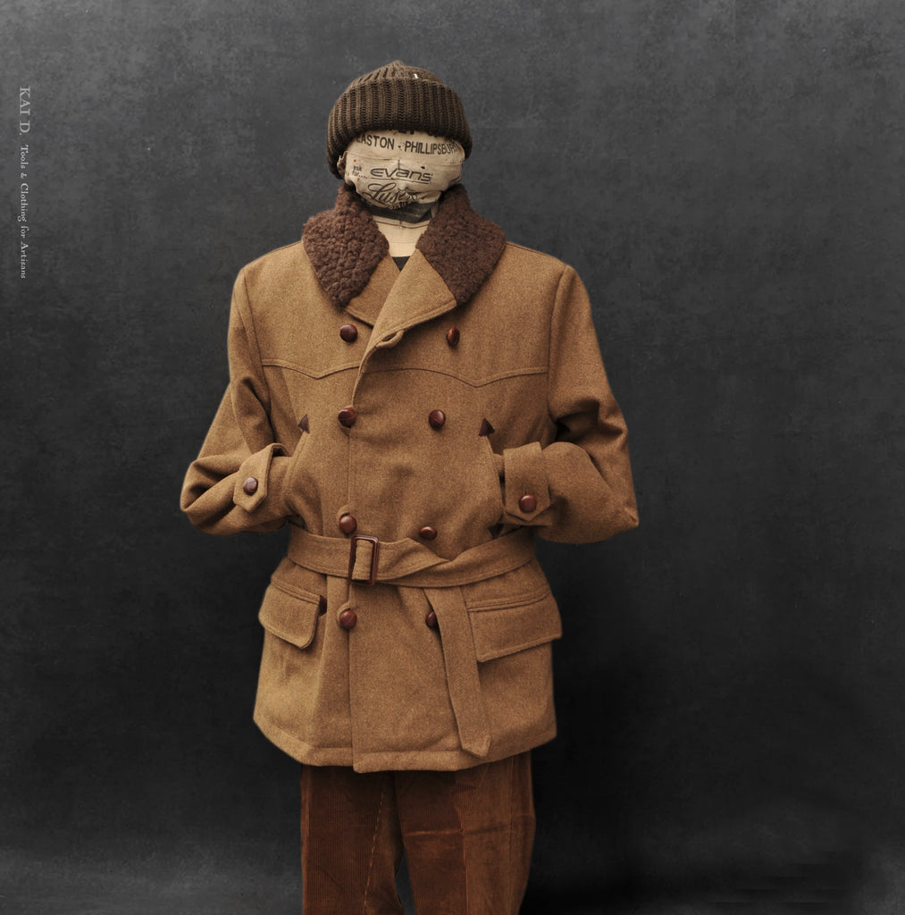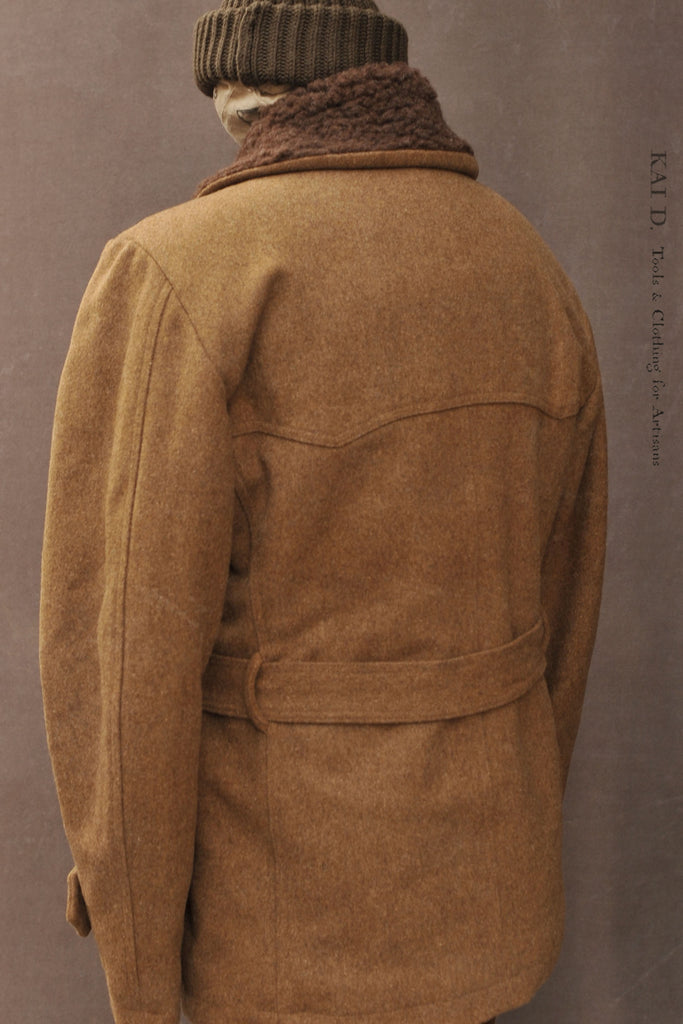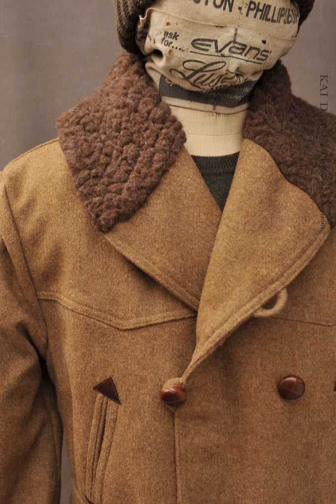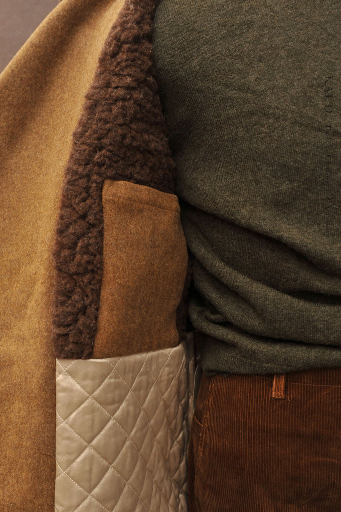 Made in heavy wool. Padded lining with quilting. Shawl collar in wool shearling.