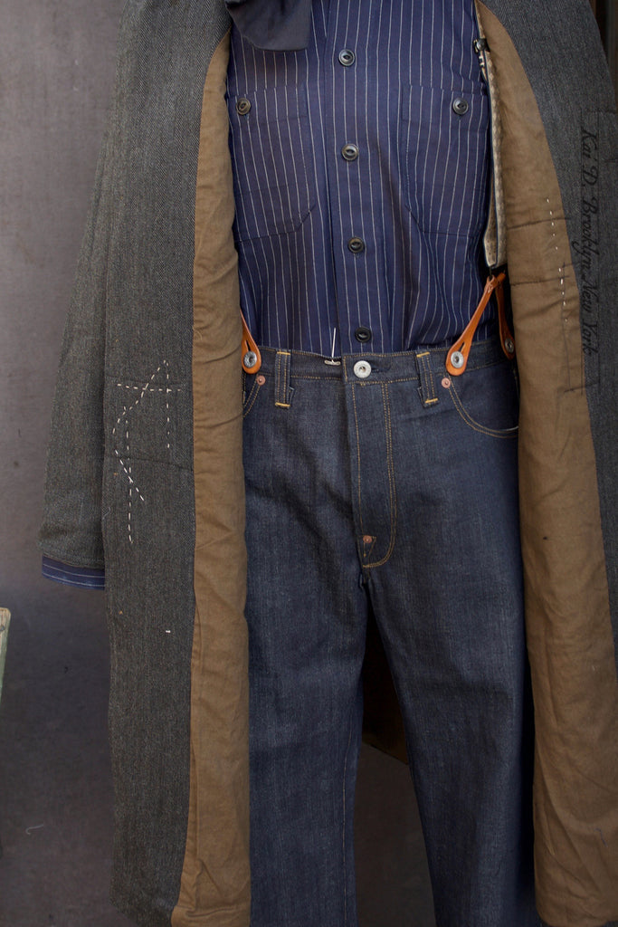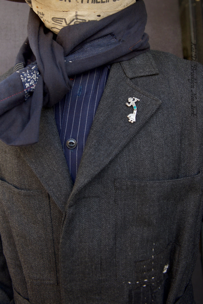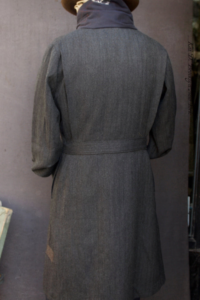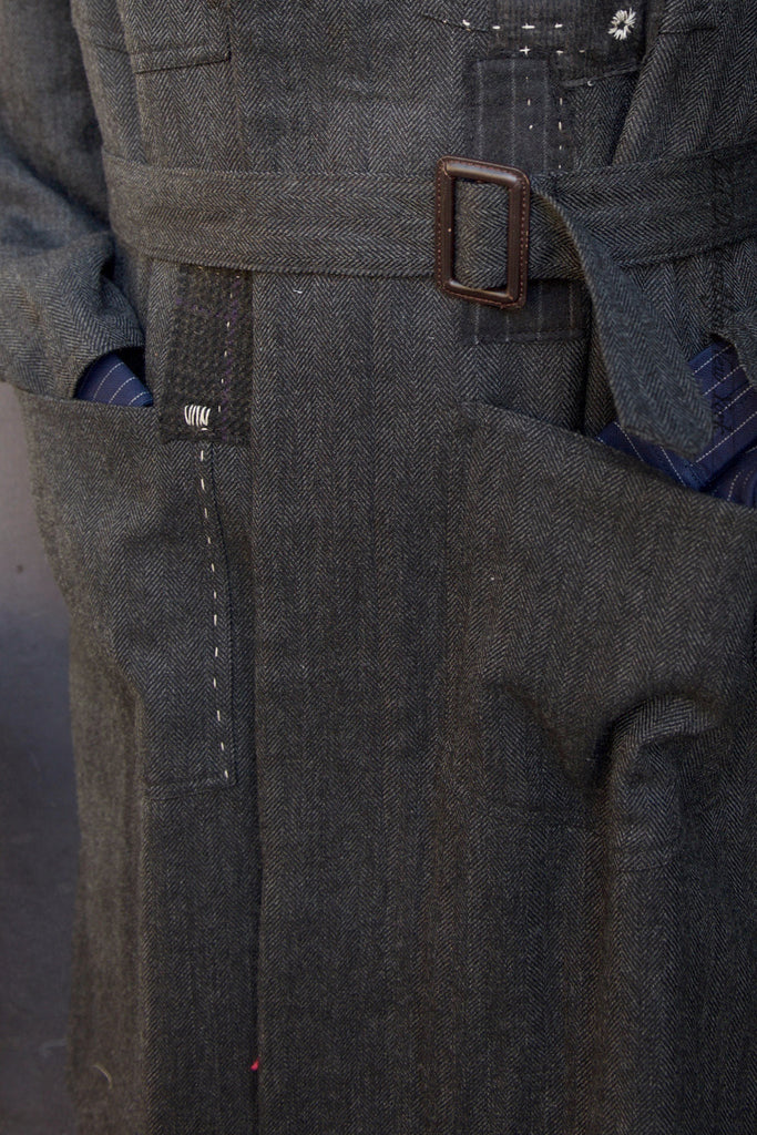 Made in Japanese herringbone wool. Fully lined with 100% soft Japanese cotton in olive color. Based on 1960s vintage lab coat with modification on collar and body shape. Hand stitched boro details.