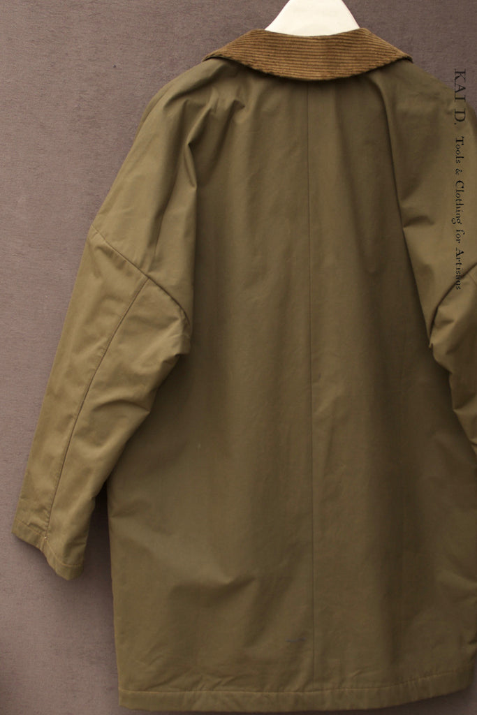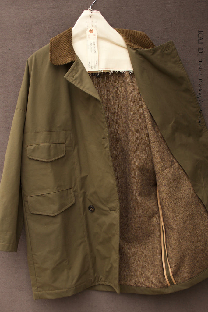 Made in coated cotton, fully lined with cotton tweed.  Dropped shoulder. Oversized.