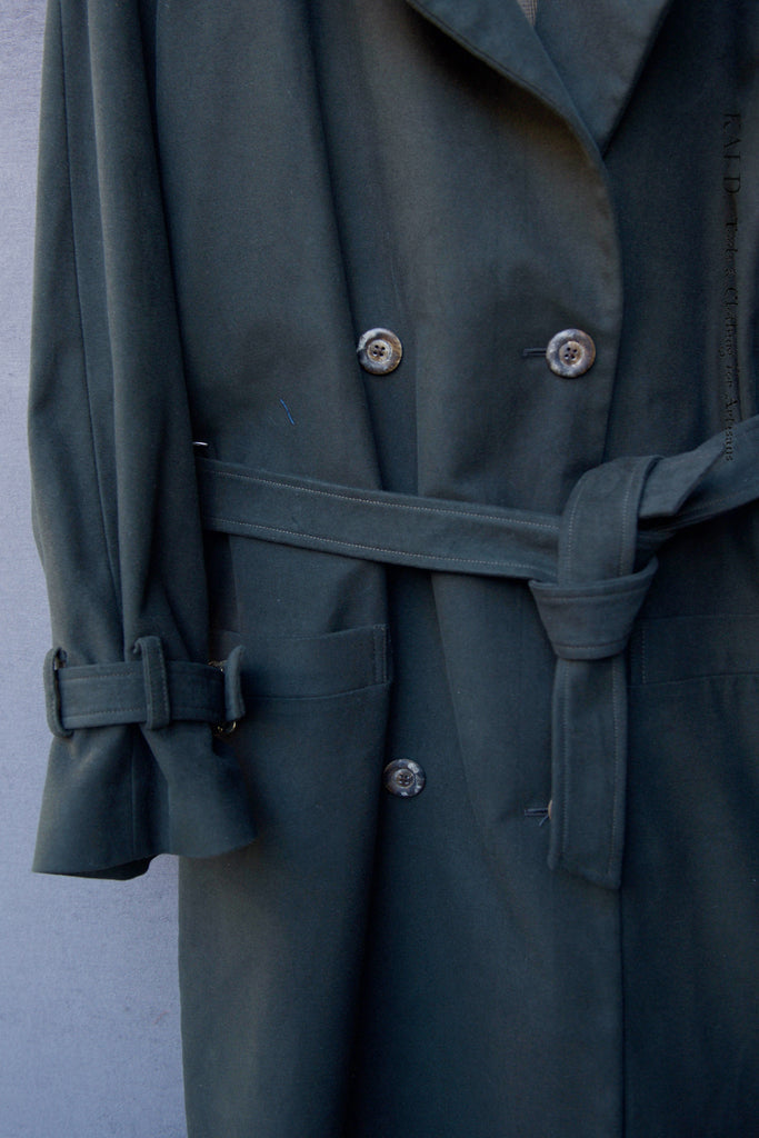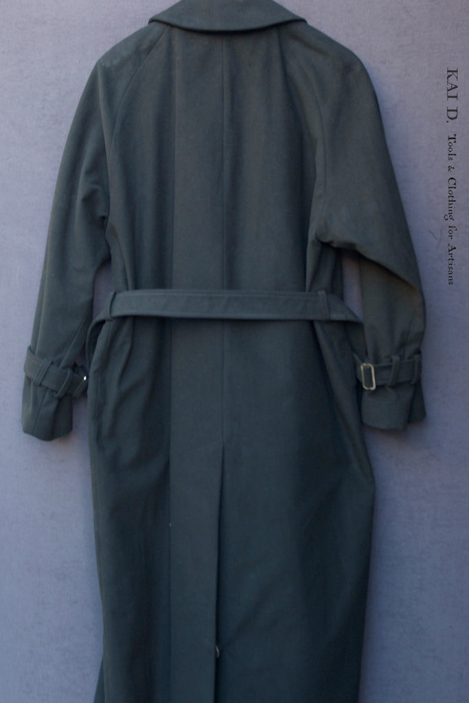 Tailored in a Japanese oxford linen-cotton blend in two toned olive. Double-breasted with a long,...