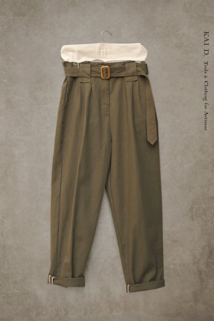 A structured cotton pant cut in Japanese herringbone twill. Garment-washed for softness. Designed with a belted waist and leather buckle, and finished with three front pleats for volume and shape. Clean front with no cargo pocket. Cropped at the ankle with a relaxed, tapered leg. Made in New York.