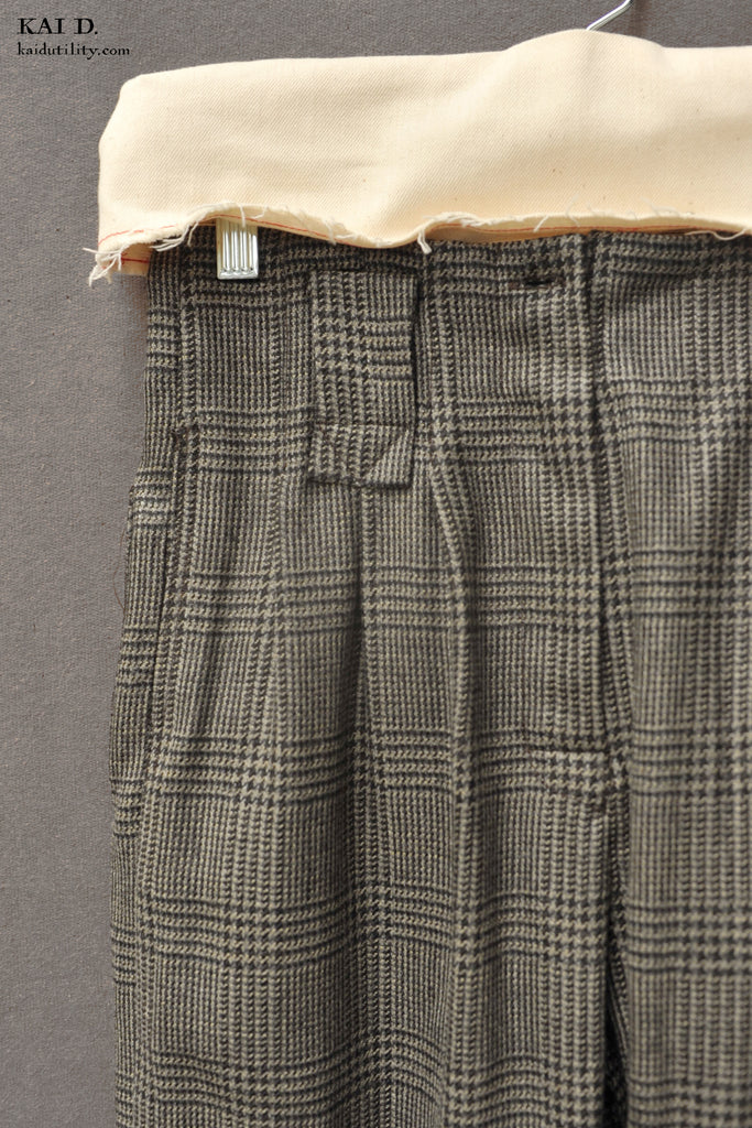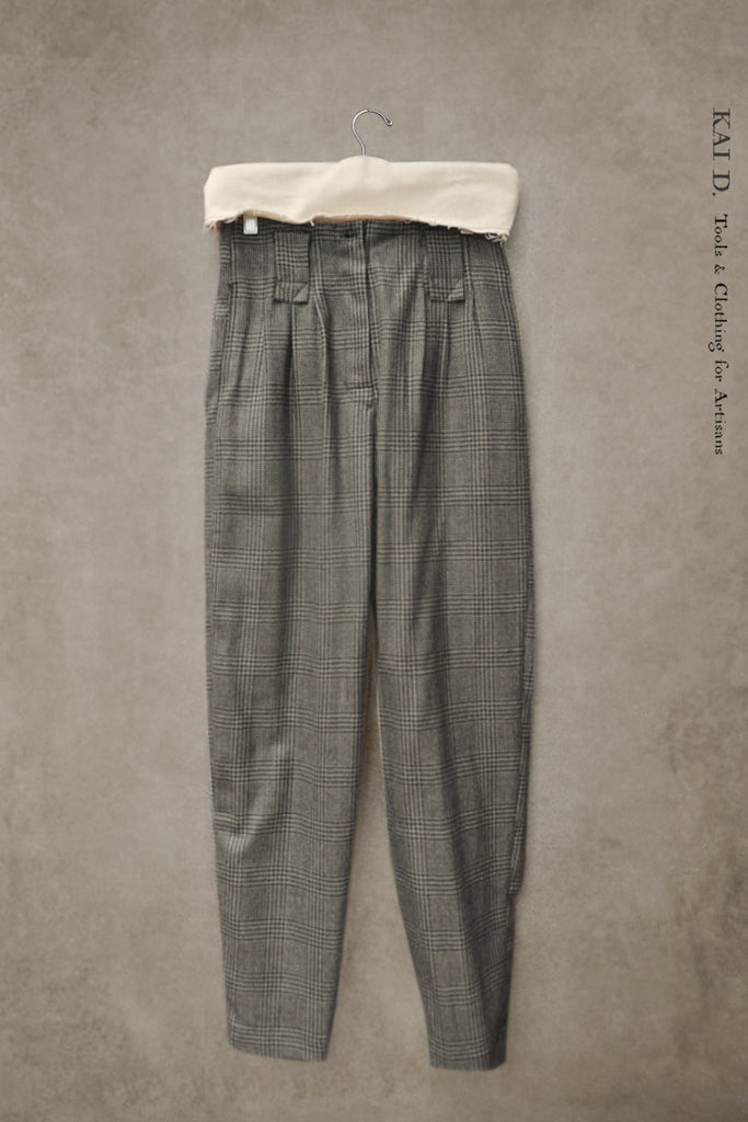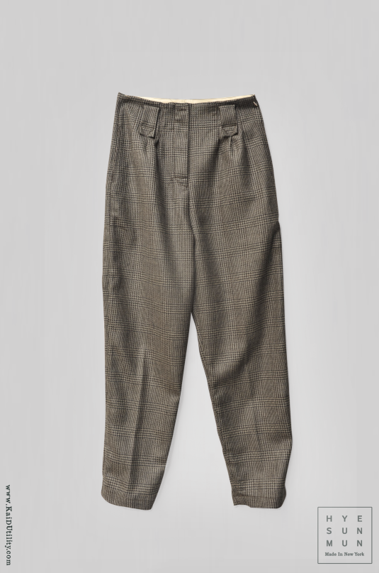 Made in light weight glen plaid soft wool. Two pleats pants with cargo pocket on the side and coffee color contrast stitch. Made in New York.