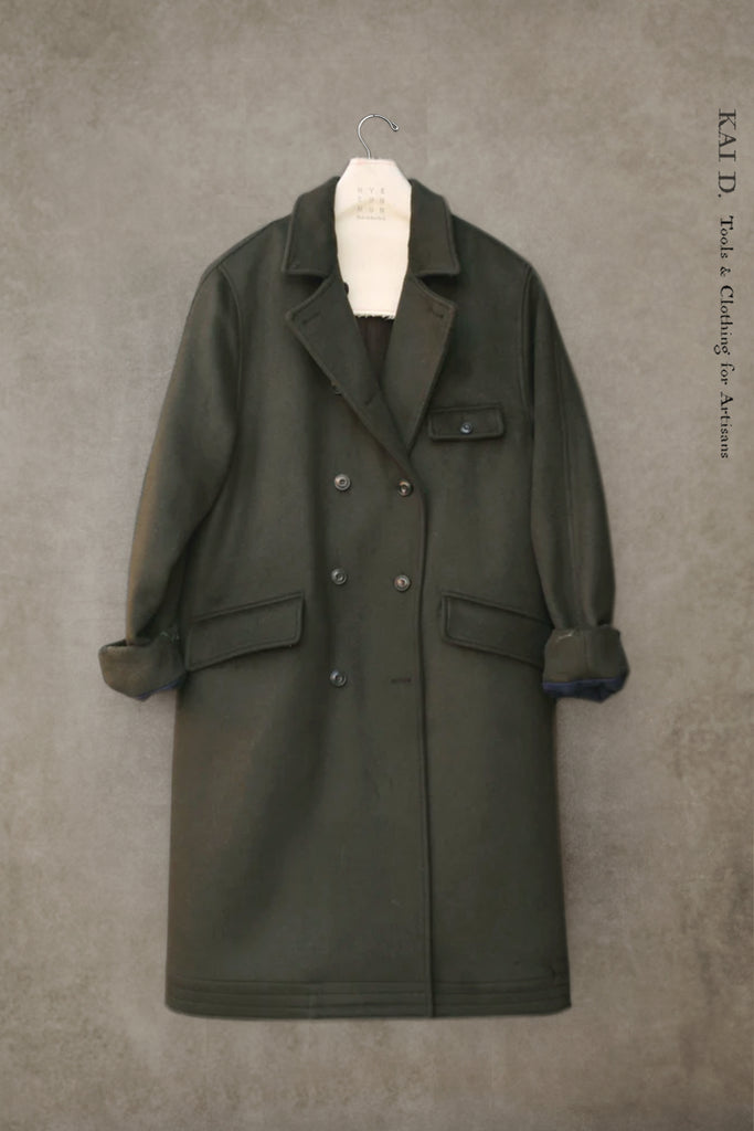 Tailored in a Japanese oxford linen-cotton blend in two toned olive. Double-breasted with a long,...