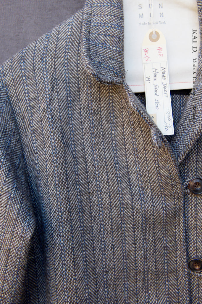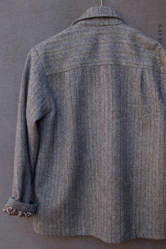 An easy work jacket in a soft Harris tweed wool. Medium-weight with a relaxed structure and soft& smooth drape. Single-layer body for movement and comfort. Inside sleeves lined in soft cotton with leaves print.