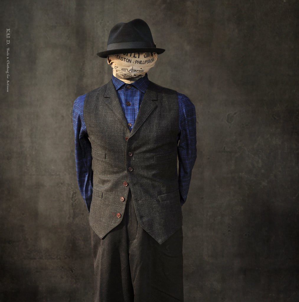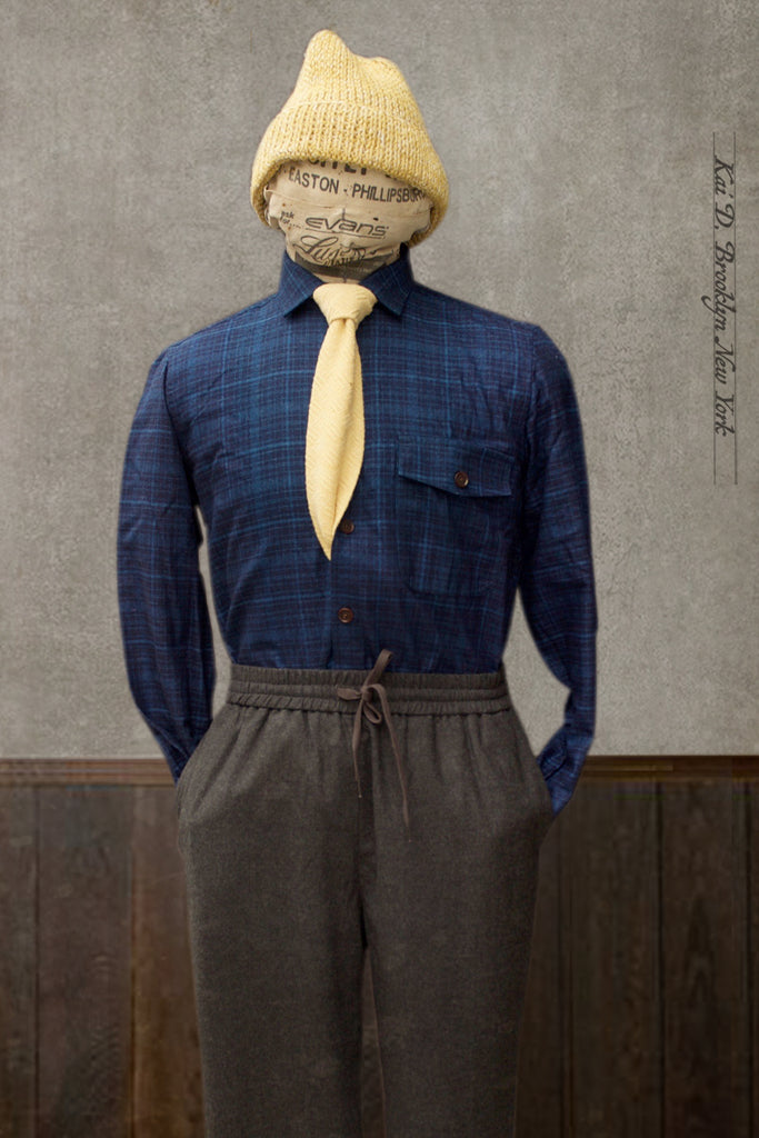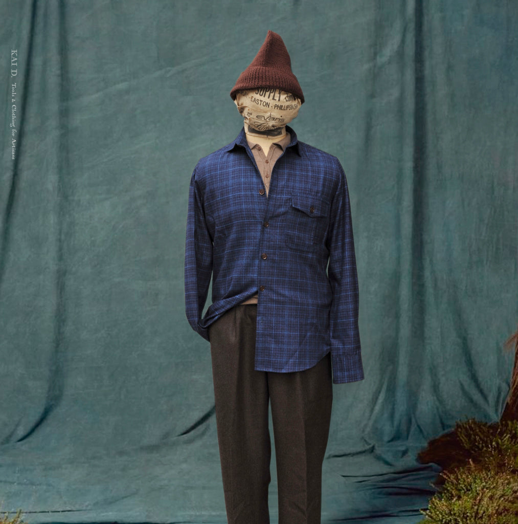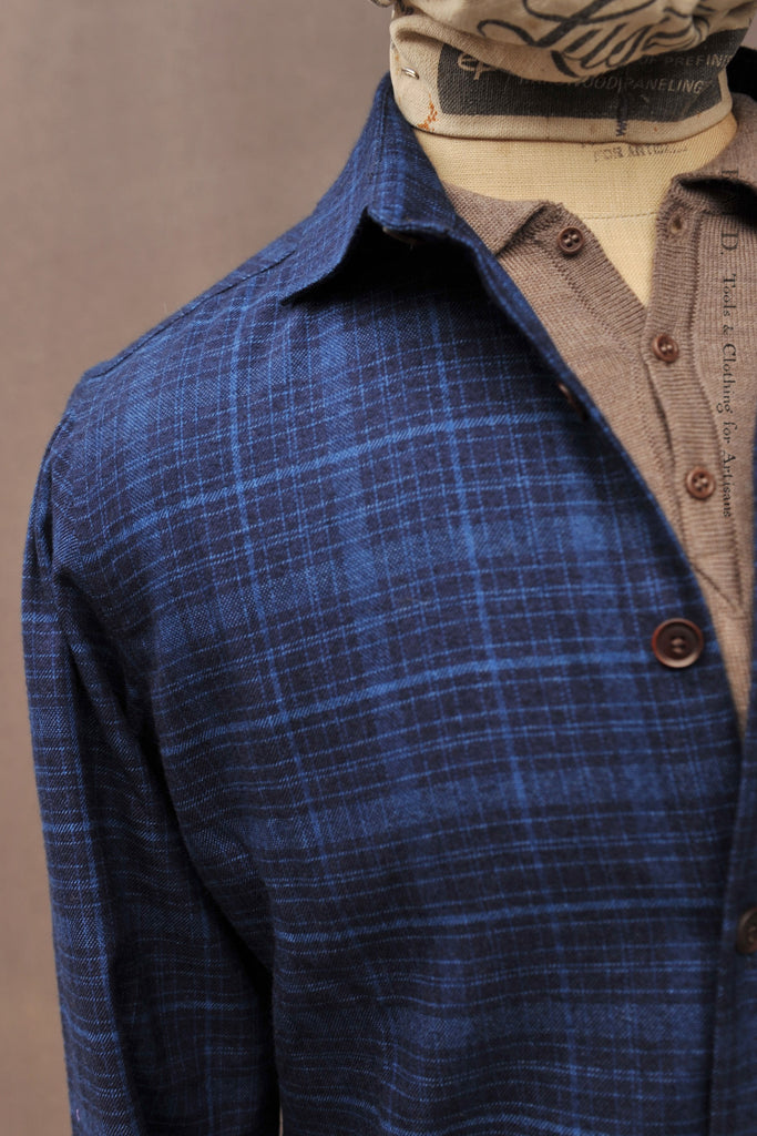 Made in a tonal indigo plaid with a very light brush finish. Very soft. Beautiful two tone indigo.