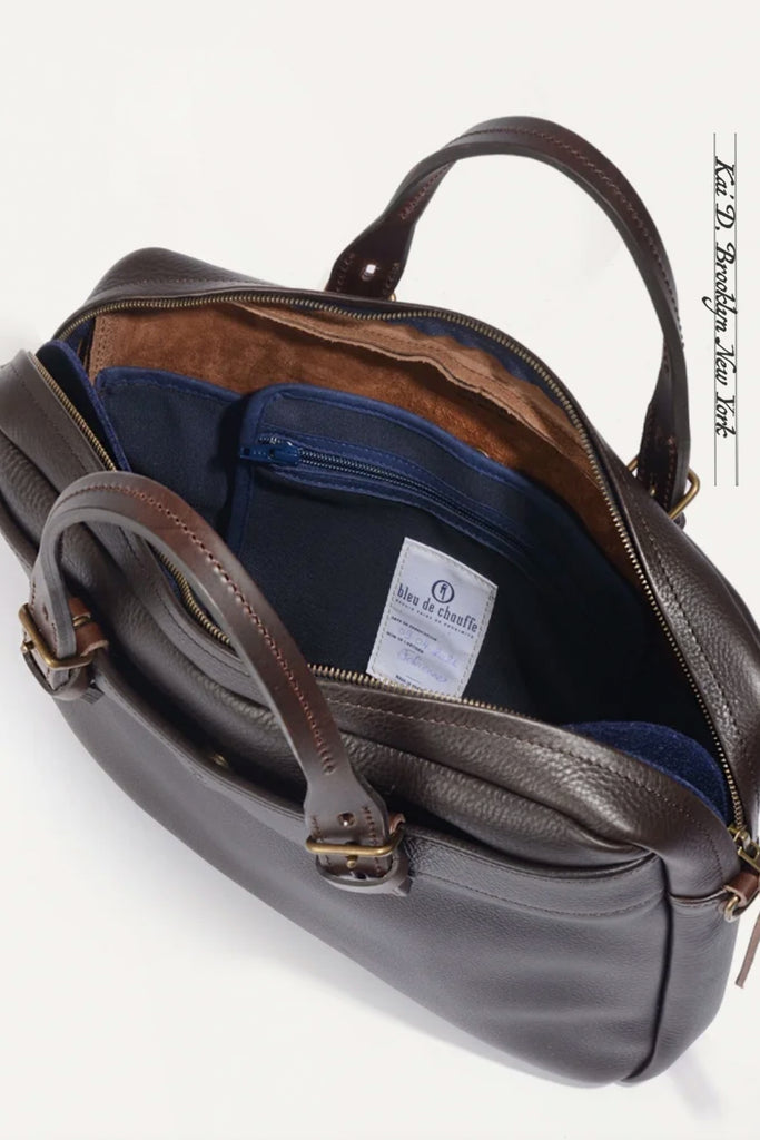 The zippered pocket at the back has been specially designed to attach the bag to your suitcase’s telescopic handle. The Bleu de Chauffe label, signed and dated by the artisan who created the bag, is sewn onto an inside zippered pocket.
