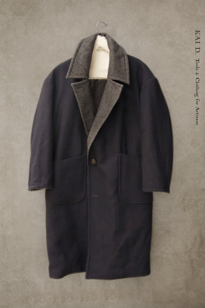 Two styles in one coat! True winter warm and cozy reversible coat. Grey herringbone wool with reversed side in heavy navy wool. Wide collar could cover your neck from the wind and perfect position of hand warmer pocket. Oversized style. Please size down.