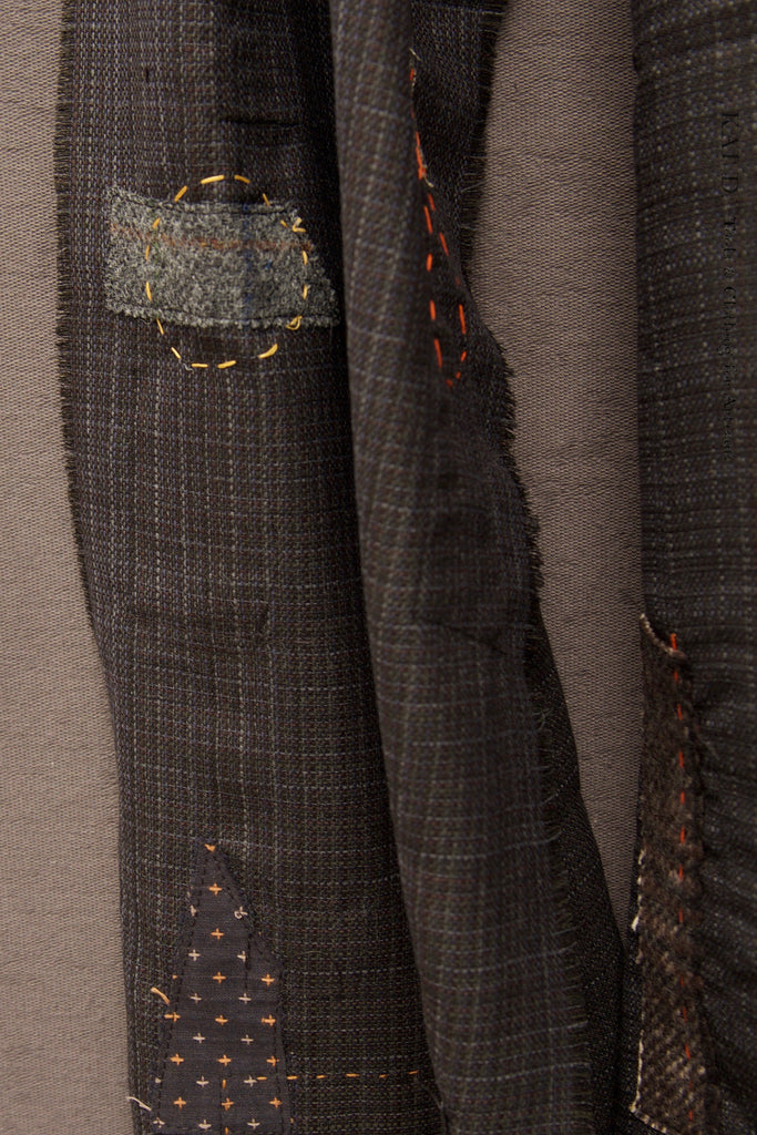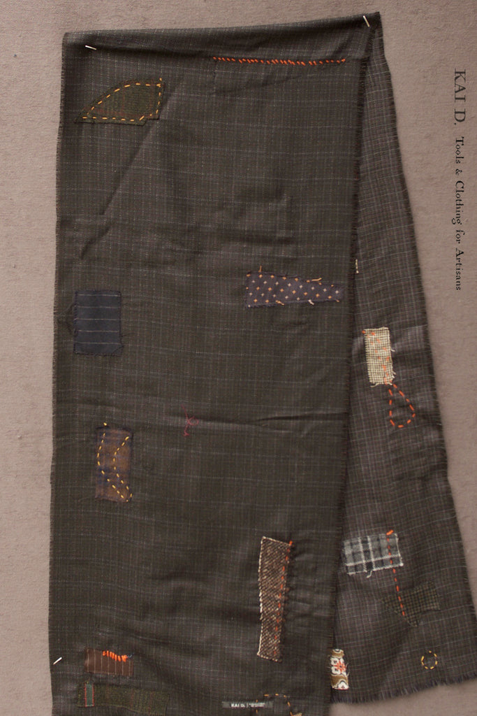 Made in a deadline Japanese light wool (very comfortable) with subtle texture weave.  Hand patched boro details.