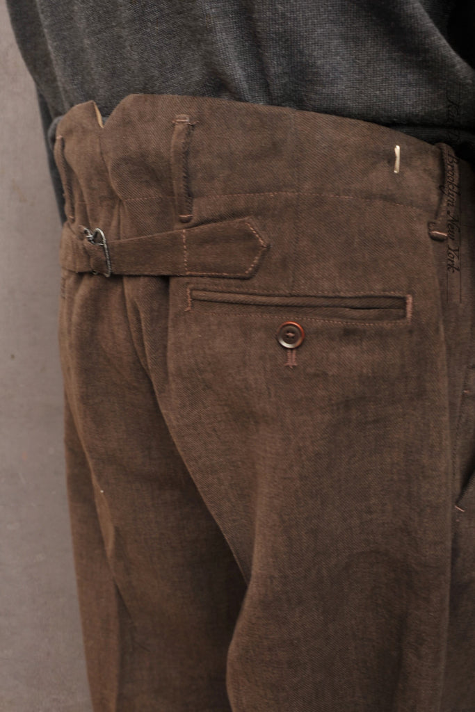 Made in Italian moleskin in deep brown color (same material as the Old Town jacket). Corozo buttons, adjustable back buckle, button fly and red tape inside outseam.