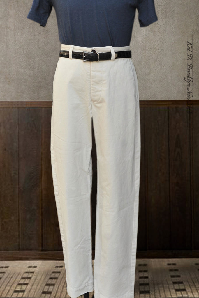 Bosun pants are our latest high waisted plain front model.  Inspired by vintage 1910s naval work pants .  Roomy around the tight with slight tapered legs.