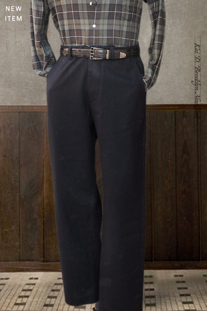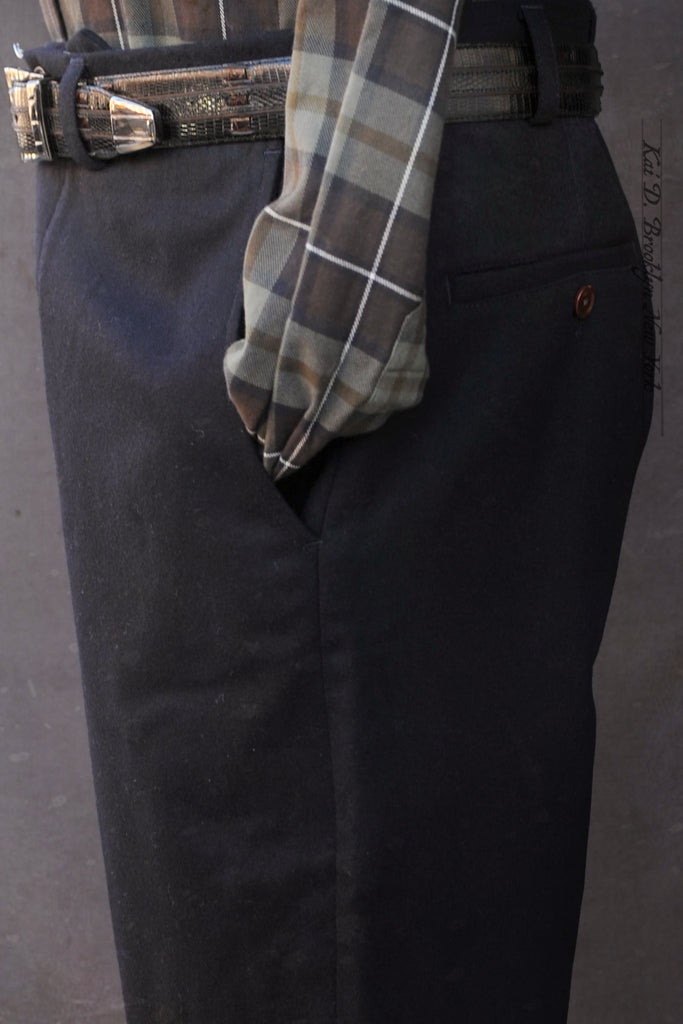 Bosun pants are our latest high waisted plain front model.  Inspired by vintage 1910s naval work pants .  Roomy around the tight with slight tapered legs.
