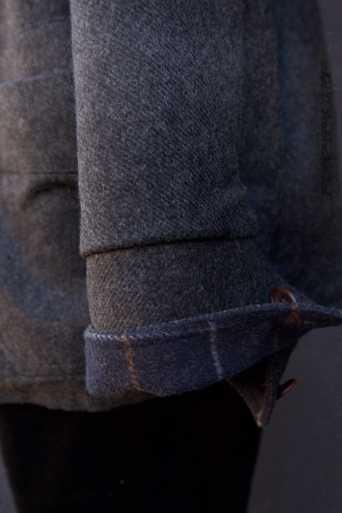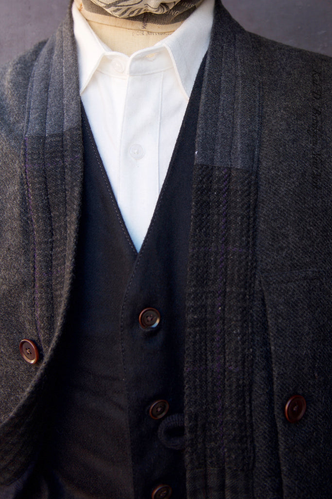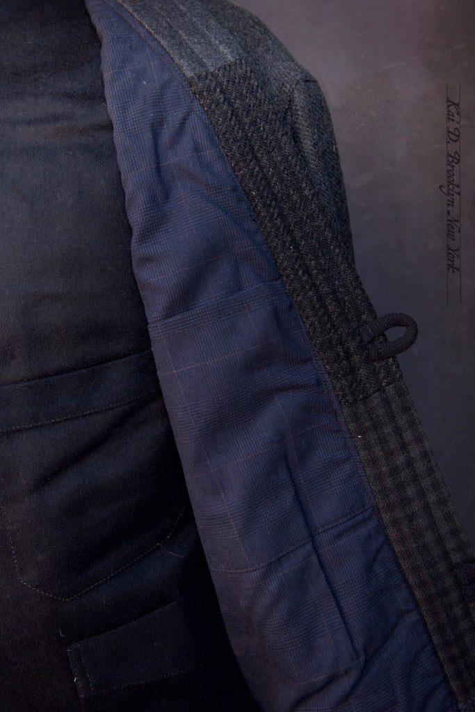 Made in Italian wool with subtle texture weave in dark charcoal color. Pieced patchwork kimono collar