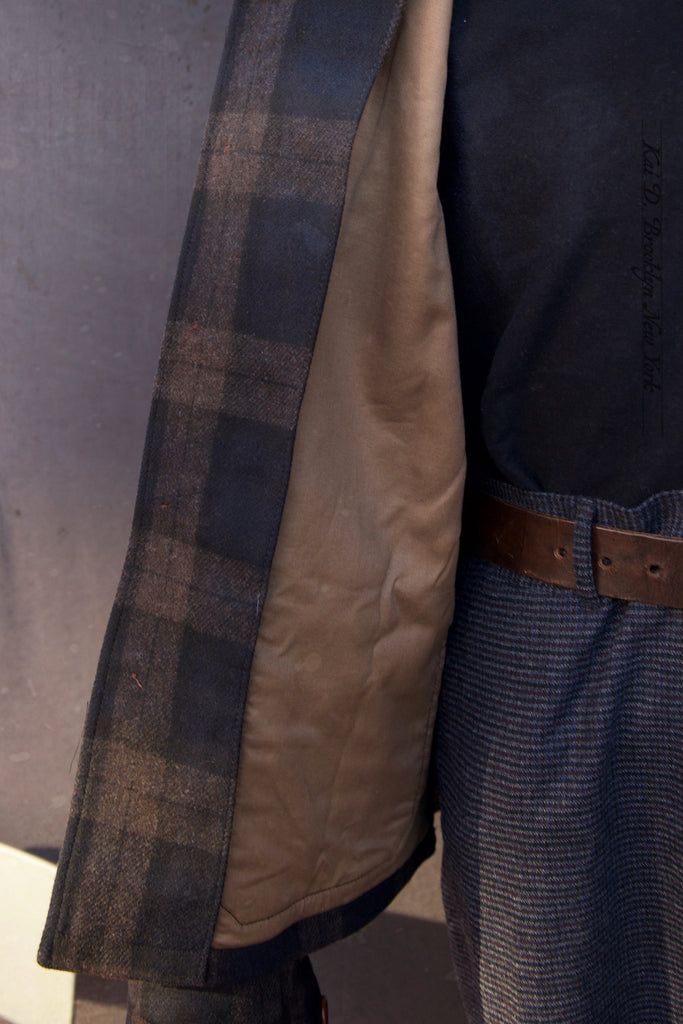 This jacket is created to serve different purposes. It is a combination of an over shirt and a work jacket. The fabric is made of a light weight Japanese wool with a classic baffalo plaid in brown and black and double layered with an ultra soft organic cotton inside body and sleeves.