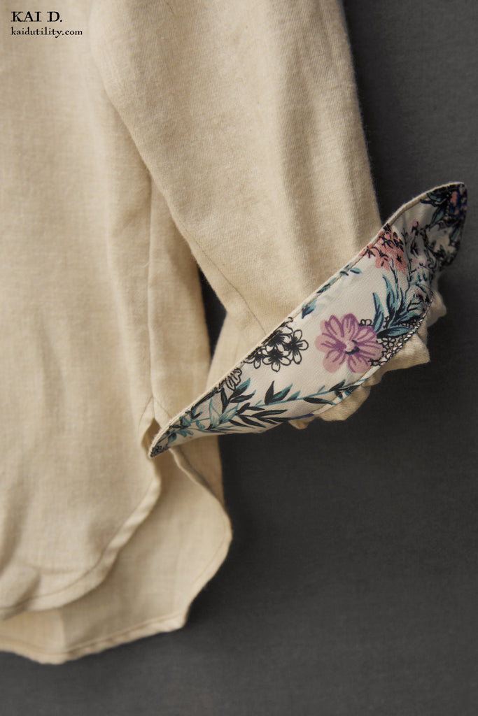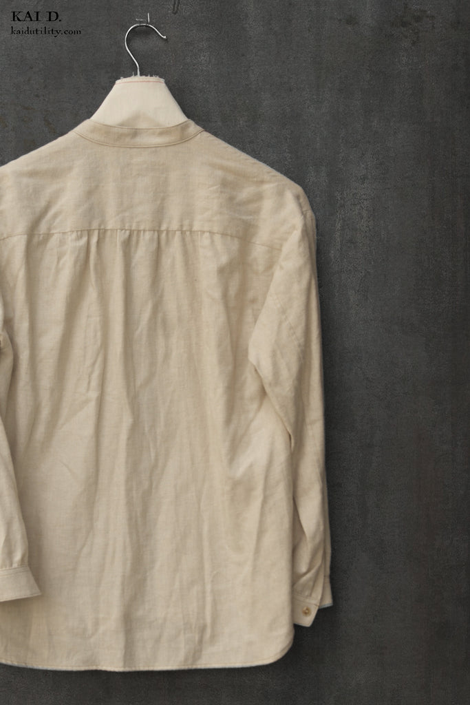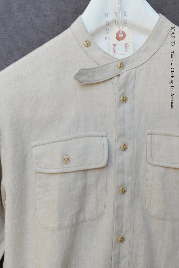 Tailored in a Japanese oxford linen-cotton blend in two toned olive. Double-breasted with a long,...