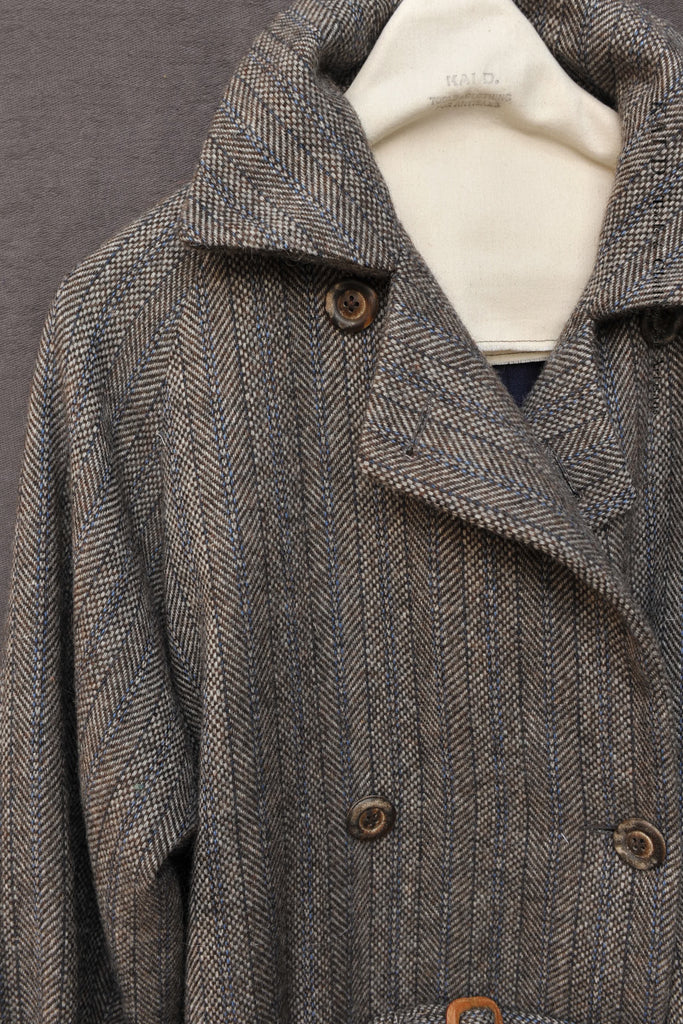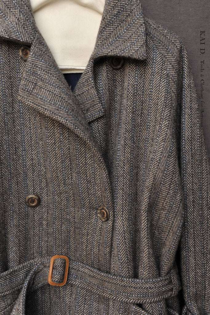 Made in genuine Harris Tweed. Double breasted. Body lining in wool cashmere. Detachable leather buckle belt.