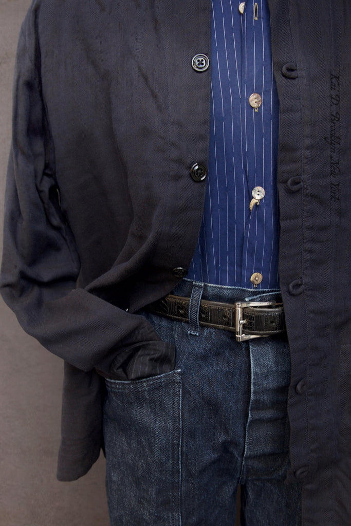 A hybrid between the Kai D. Monk Shirt and Meeker Jacket.  It can be worn as a shirt or as a light layering jacket.  It can be casual daily wear as well as formal wear.  The inside sleeve cuff is trimmed with super 120 virgin wool.