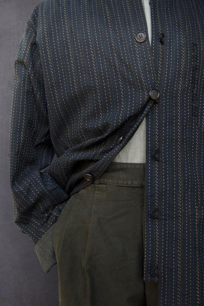 A hybrid between the Kai D. Monk Shirt and Meeker Jacket. It can be worn as a shirt or as a light layering jacket. It can be casual daily wear as well as formal wear. The inside sleeve cuff is trimmed with super 120 virgin wool.