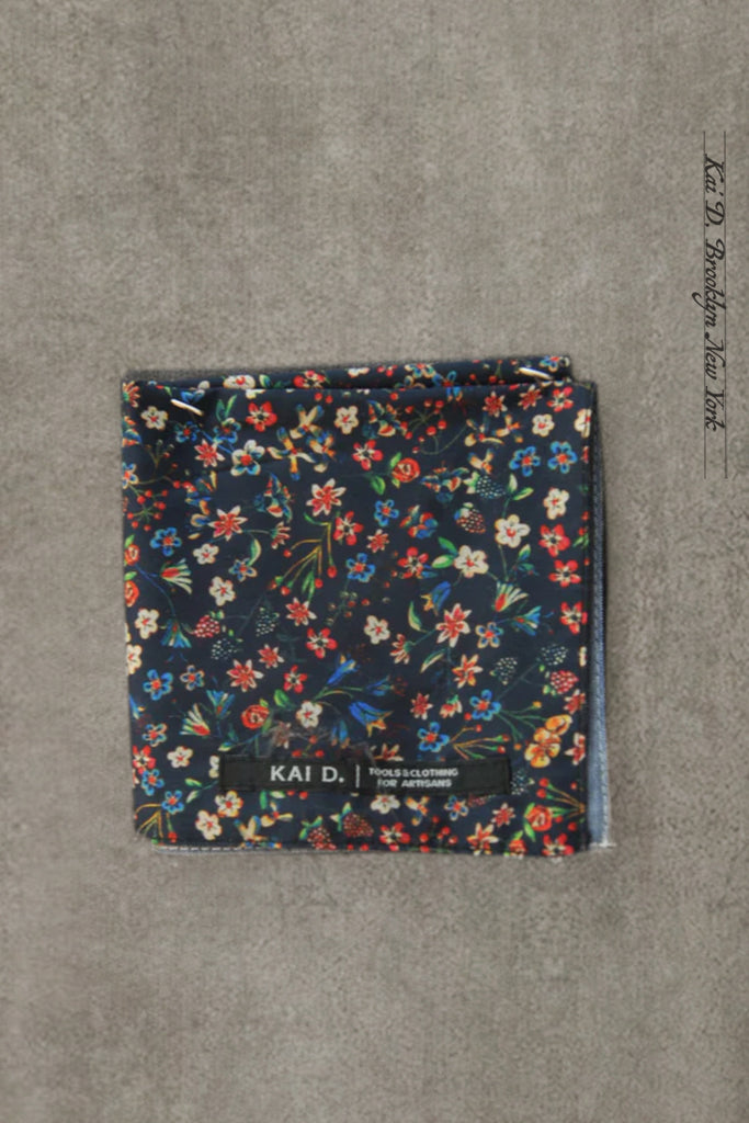 Pocket square in Liberty print cotton.  Reversed side in Japanese chambray cotton.  Size: 9" x 9"