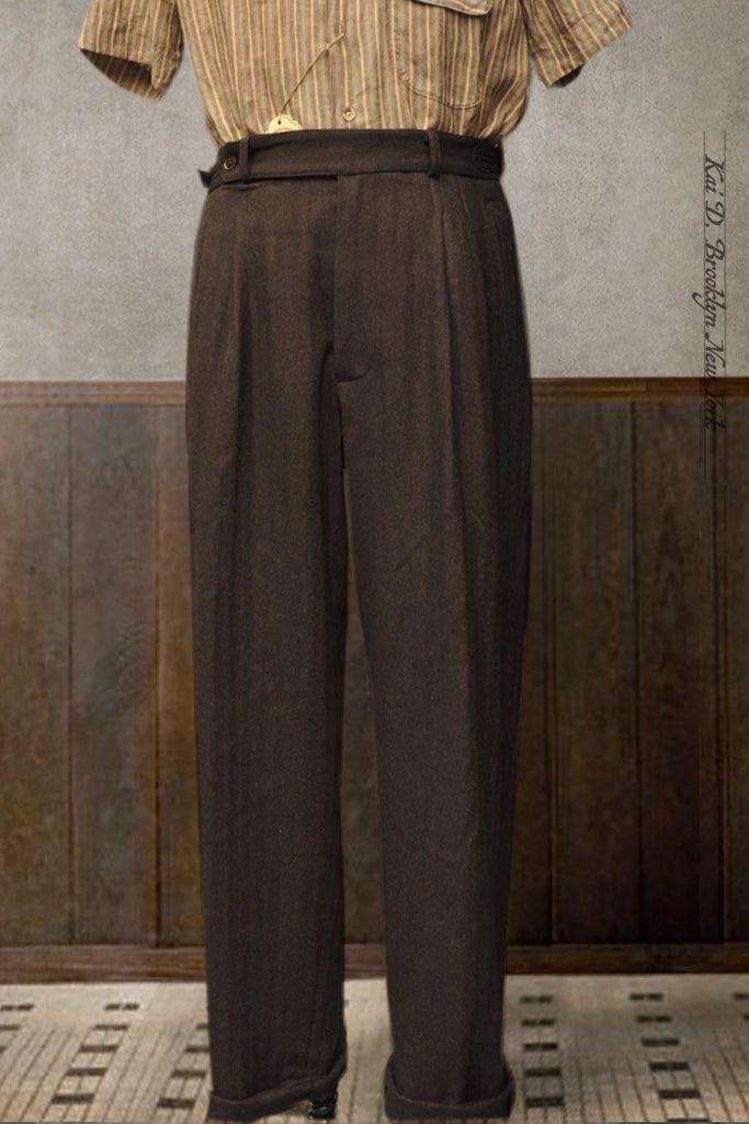 Made in Italian wool cashmere blend with herringbone weave.  30s' pleated wide leg pant silhouette.